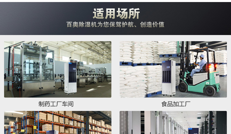 空氣干燥:百奧工業除濕機廣泛應用于貴重物品倉庫、制藥、食品、電子、皮革、鞋業、家具、印刷制品、化工、煙草等諸多行業。使物品避免了因潮濕、霉變帶來的重大損失。產品適用面積大,特別適用于大型車間及倉庫使用